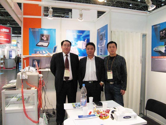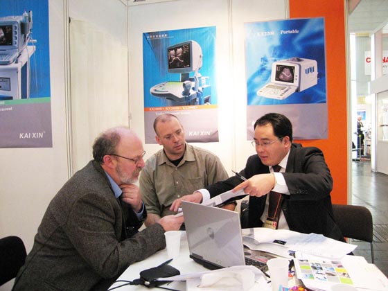与往年不同的是,此次展会的展品多为凯信公司即将推出的最新产品,如便携数字B超KX2600、KX2200和手持式的KX5100。这些产品不但在外观设计上与传统产品有较大区别,在图像质量和操作方法上也有很大的提高。 特别是小巧玲珑的KX5100数字B超,在赶赴德国之前就早早被德国一家知名超声公司定下样品,并在其展位上陈列宣传。展会四天期间,接待世界各地的新老客户百余人,当场签订合作意向的就有数十家公司,可谓硕果累累,规模空前。同时,随着各类产品CE认证的不断完成,进军欧洲市场已经指日可待了。目前,凯信电子国际贸易部正全力以赴,整合资源,为明年的海外市场再创佳绩做好一切准备。